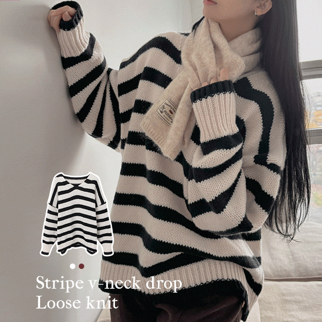 [체형커버!/스트라이프] 단가라V넥드롭루즈니트티 (2color)