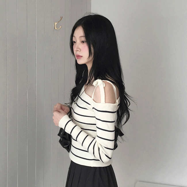 [슬림핏/데이트룩💘] 여리리본오프숄더니트티 (4color)