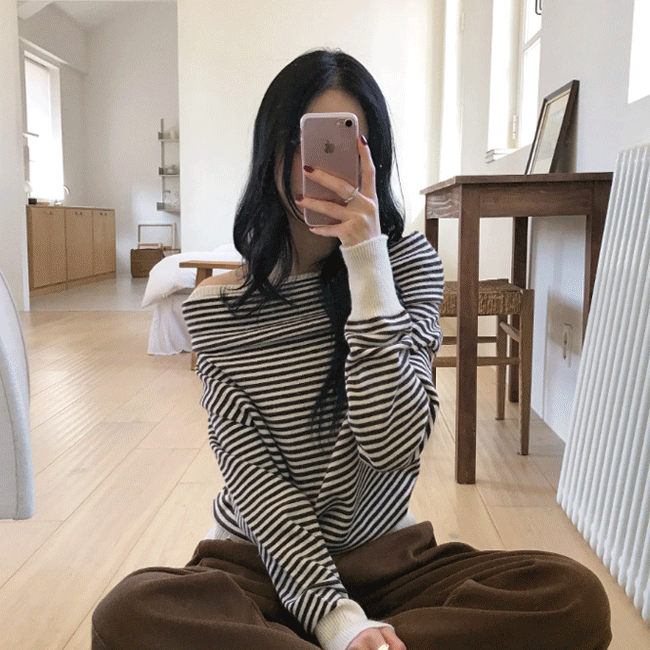 [스트라이프/청순여리🍒] ST배색오프숄더니트티