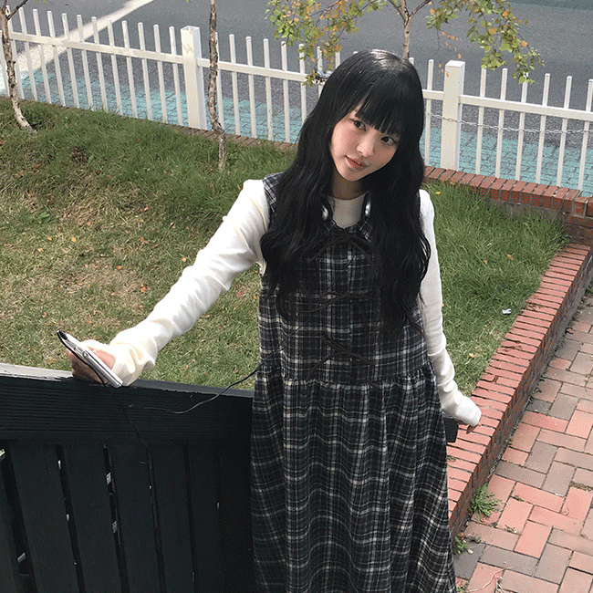 [귀여운핏🧸/도톰] 포근체크리본카라롱원피스 (2color)