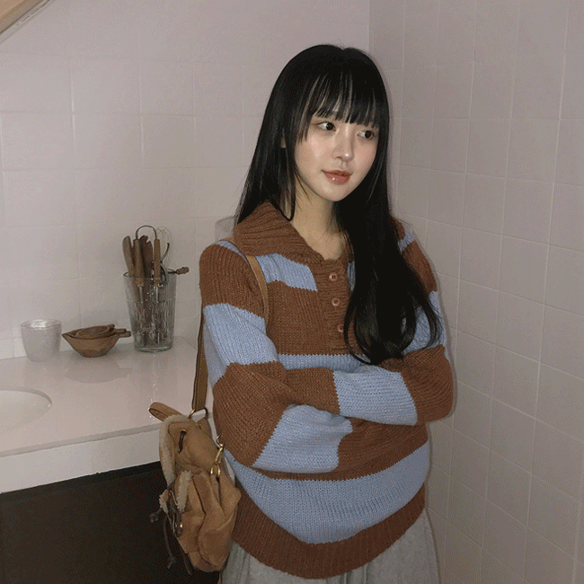 [카라티/스트라이프] 단가라배색카라버튼니트티 (3color)
