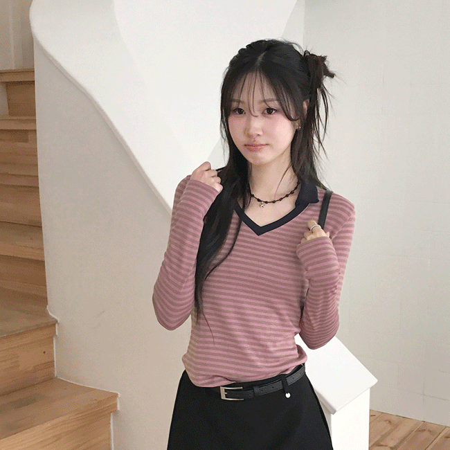 [여리슬림핏🩰/스트라이프] 단가라배색슬릿V넥니트티 (4color)