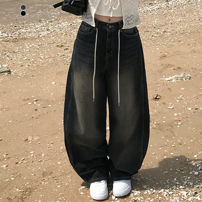 [빈티지워싱🖤/데일리] 힙워싱스트링와이드데님팬츠 (2color)