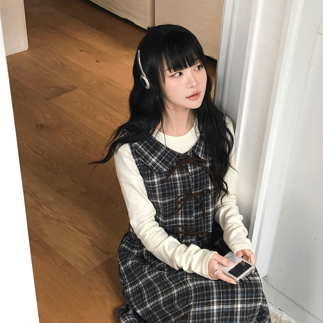 [귀여워요🧸/빈티지] 포근체크리본카라롱원피스 (2color)